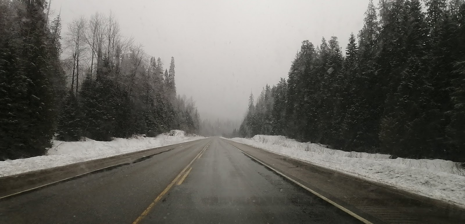 My boy and I left behind the mostly sunny (with just a few cloudy/rainy spots) and clear roads of British Columbia and ventured forth into wet with increasing snowy trails heading East, then North.
